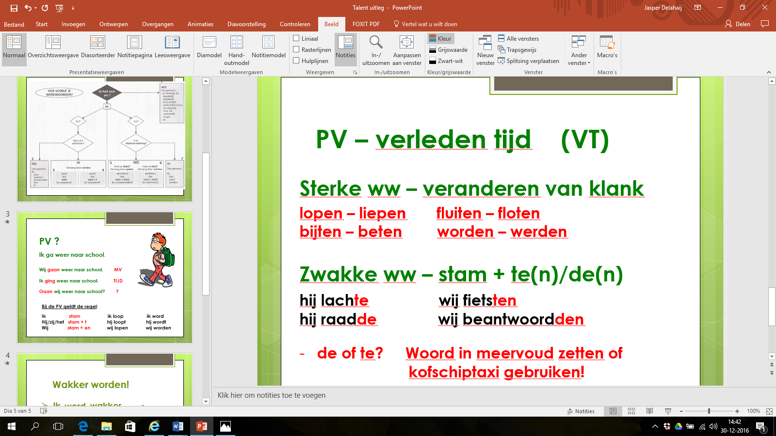 1.1.1. De docent toont aan dat hij een lerende professional is die zelfstandig, creatief en kritisch gebruikt maakt van de (nieuwe) mogelijkheden van ICT bij leren, lesgeven en organiseren van onderwijs. Digiborden, iPads, computers, maar ook mobieltjes zijn tegenwoordig niet meer weg te denken uit het hedendaagse onderwijssysteem. Tijdens mijn lessen probeer ik daarom op verschillende manieren ICT te gebruiken. Als ik bijvoorbeeld met een nieuw onderwerp begin, gebruik ik vaak een PowerPoint als ondersteuning. Hiermee probeer ik de les aantrekkelijker en actiever te maken. Tegelijkertijd hou ik rekening met verschillen tussen leerlingen (visuele leerstijl). Hieronder vindt u een screenshot uit een (willekeurige) PowerPoint-presentatie: