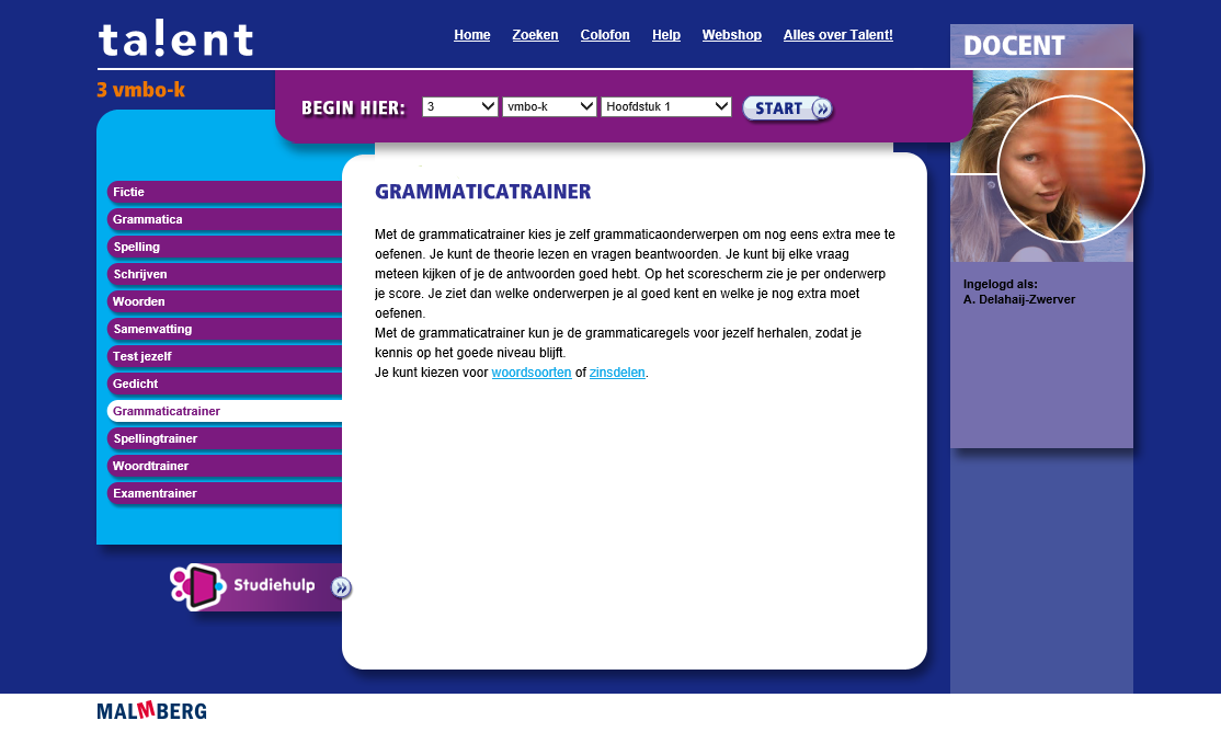 Tijdens de lessen Nederlands werk ik met de methode Ta!ent. Deze methode heeft een e-pack, dat ik op verschillende manieren inzet (tijdens computerlessen, als differentiatie en/of als huiswerk). Ta!ent heeft ook een e-pack versie waar je de voortgang van de leerling mee kan bijhouden. Helaas heb ik daar nog niet mee kunnen werken, omdat wij deze versie in de onderbouw gebruiken en ik lesgeef aan de bovenbouw. Hieronder vindt u een screenshot van de homepage van de digitale component van Ta!ent: