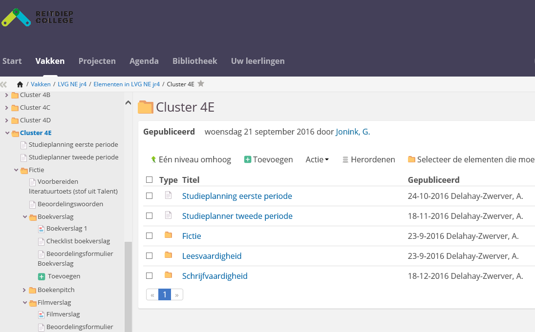 Voor de organisatie van mijn onderwijs gebruik ik de website It's Learning. Deze site wordt door al het personeel van het Leon van Gelder vrij intensief gebruikt. Ik ben de afgelopen drie jaren ook meer met It's Learning gaan werken. Ik maak voor mijn klassen mappen aan waar ze planningen, PowerPoints en linkjes naar websites of filmpjes kunnen vinden. Daarnaast bied ik ook ander lesmateriaal aan en plaats ik opdrachten die leerlingen digitaal kunnen inleveren (als back-up, maar ook zodat ze er thuis aan verder kunnen werken). Het voordeel van opdrachten digitaal laten inleveren is enerzijds de bereikbaarheid van het materiaal en anderzijds de mogelijkheid tot plagiaatcontrole en het instellen van een deadline. Hieronder vindt u een screenshot van It's Learning. U ziet een mapje die leerlingen kunnen vinden bij het vak Nederlands jaar 4 (LVG NE jr4) en waar ze vervolgens hun eigen clustergroep kunnen aanklikken voor het lesmateriaal: