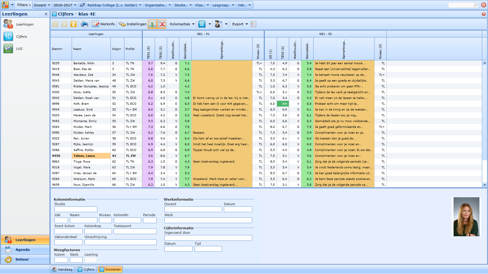 Verder gebruik ik Magister om mijn onderwijs te organiseren. Net zoals het It's Learning platform is Magister een onderdeel van de dagelijkse gang van zaken bij ons op school. Dit digitale volgsysteem biedt vele voordelen: naast het invoeren van huiswerk en absenties, kunnen de cijfers en het LVS (leerlingenVolgSysteem) worden bijgehouden. Hieronder vindt u een screenshot van Magister met een cijferoverzicht van periode 1 en 2: