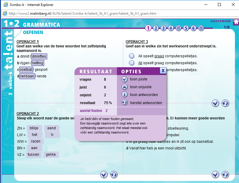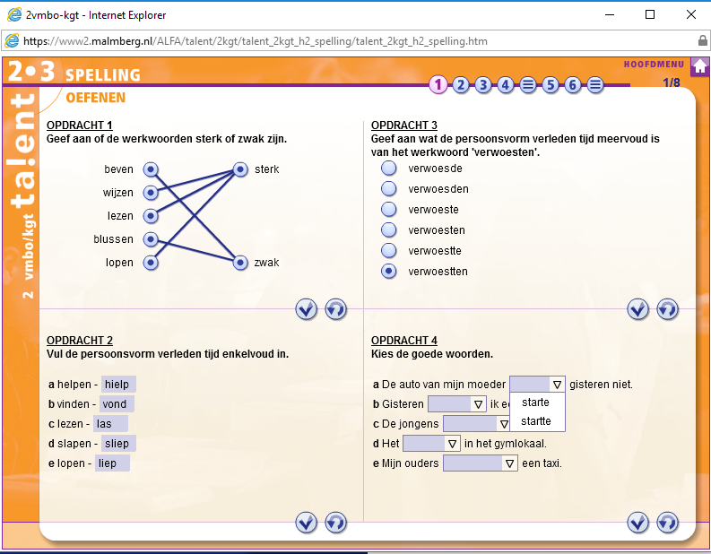 Ik geef drie keer per week de les Nederlands aan een klas. Twee lessen zijn in een theorielokaal en één les van 55 minuten in een computerlokaal. Naast het e-pack van Ta!ent gebruik ik andere (schrijf-)opdrachten om het zelfstandig, maar ook het samenwerkend leren te bevorderen. Soms gebruik ik daarvoor de krant 7Days en laat ik ze bijvoorbeeld in tweetallen een artikel schrijven. Soms doen ze dat indivudueel en laat ik ze op het eind doorschruiven en geven ze feedback op elkaars schrijfwerk. Het voorbeeld dat ik wil laten zien, is een les uit het e-pack van Ta!ent. Tijdens de vorige les heb ik de spellingsregels van de verleden tijd met ze behandeld. Deze computerles moesten ze in tweetallen de oefenopdrachten maken en daarna individueel de toets. Ik had van tevoren tweetallen gemaakt, waarbij ik rekening hield met de niveauverschillen. Bij deze oefening moesten ze na elke twee opdrachten afwisselen en de opdracht hardop denkend maken. Ik wilde hiermee bereiken dat de zwakke leerling meer inzicht en een betere beheersing van de spellingsregels zou krijgen. Voor de sterke leerling bood het de uitdaging om de regels uit te leggen. Hieronder vindt u een screenshot van een aantal oefeningen die de leerlingen hebben gemaakt: