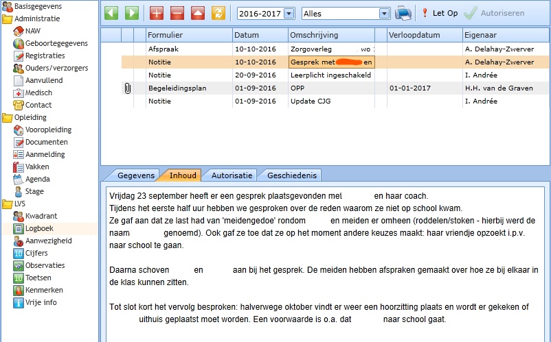 Daarnaast gebruik ik het als vakdocent en mentor om de logboeken van (mentor)leerlingen bij te houden, zodat ik mijn collega's en het ondersteuningsteam kan informeren. De namen heb ik wegens privacyredenen weggehaald. Hieronder vindt u een screenshot van Magister met een overzicht van het logboek van een mentorleerling: