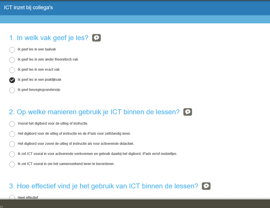 1.3.2. De docent toont aan dat hij zoekt naar (interdisiplinaire) samenwerking met collega's die in een vergelijkbare situatie rondom onderwijs en ICT verkeren. Ik heb nog nooit een enquête over de inzet van ICT bij collega's afgenomen. Om aan te tonen dat ik dit wel zou kunnen, heb ik via SurveyMonkey een korte enquête gemaakt. Ik heb wel eerder enquêtes gemaakt (voor mijn studie en werk), maar gebruik daar eigenlijk altijd It's Learning voor. Het leek mij interessant om eens een ander programma te gebruiken en ik heb daarom een aantal vragen met betrekking tot ICT bedacht. Hieronder vindt u een screenshot van mijn SurveyMonkey-enquête: