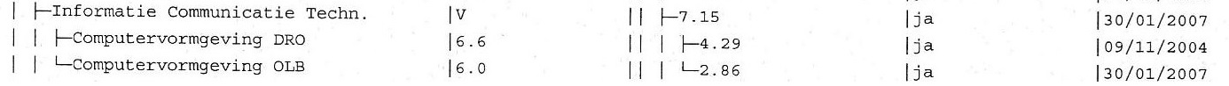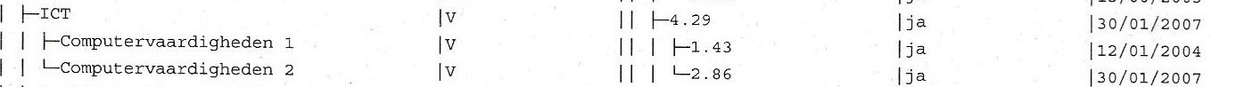 2.2.3. De docent toont aan dat hij kan omgaan met standaard kantoortoepassingen: tekstverwerkers, spreadsheetsprogramma's en presentatiesoftware. Voor mijn eerste opleiding aan de NHL moest ik twee ICT-cursussen (Computervaardigheden 1 en 2) halen om verder te mogen studeren. De digitale programma's waarover 'getoetst' werd waren: Word, PowerPoint, Excel en Access. Vooral de eerste drie Office-programma's gebruik ik nog regelmatig. Hieronder vindt u een (deel van een) scan van mijn cijferlijst, afkomstig uit mijn Bachelor Degree.