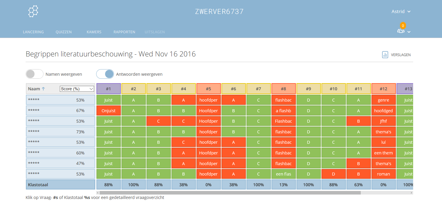 Tegenwoordig gebruik ik dus vooral het digibord. Soms laat ik leerlingen interactief (samen)werken aan bijvoorbeeld een Kahoot- of een Socrativequiz. Hieronder vindt u een voorbeeld van de resultaten van een Socrative 'ruimteship game', die ik naderhand op het bord heb geprojecteerd om de antwoorden te bespreken. Overigens hadden leerlingen vraag 5 en 8 wel goed beantwoord, maar hadden ze geen lidwoord gebruikt.