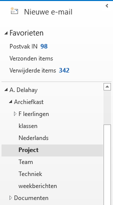 Mijn eigen bestanden, die ik deel met leerlingen en collega's, bewaar ik altijd keurig in mapjes. Ik vind het prettig om bestanden snel terug te kunnen vinden en wil ook dat mijn informatie gebruiksvriendelijk is voor leerlingen. Ook mijn e-mail is geordend in mapjes. Aangezien ik 4 jaar lang mentor ben van een klas, heb ik voor elke leerling een eigen mapje waar ik mailwisseling van/over een desbetreffende leerling in bewaar. Hieronder vindt u een screenshot van It's Learning waarop mijn mappenstructuur zichtbaar is (van klas 4D) en daaronder heb ik drie fragmenten uit mijn schoolmail geplaatst: