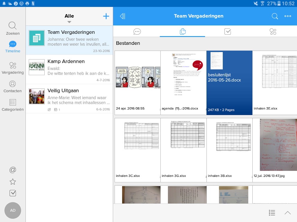 2.2.2. De docent toont aan dat hij de vaardigheden beheerst om met software effectieve samenwerking en communicatie tot stand te brengen. Vorig schooljaar heeft mijn team een poosje gecommuniceerd via Moxtra. We werkten daarnaast met e-mail en It's Learning, maar Moxtra had echter een aantal voordelen: je kreeg een melding als er een nieuw bericht of bestand werd geplaatst en er zat een chat-functie op. Daarnaast kon het als app op je mobiel of tablet installeren. Dit jaar maken wij geen gebruik meer van Moxtra, omdat we op teveel plekken onze informatie moesten zoeken en er collega's waren die niet constant met werk geconfronteerd wilde worden. Tegenwoordig maken wij meer gebruik van een groepsapp (via WhatsApp). Hieronder vindt u een screenshot van Moxtra en hoe wij bestanden met elkaar deelden: