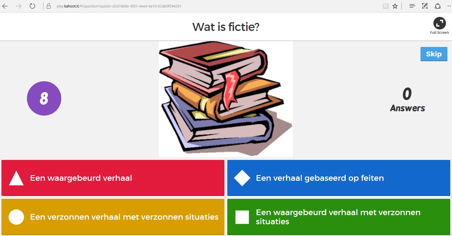 2.2.6. De docent toont aan dat hij educatieve software, serious games en mobiele apps kan inzetten. Bij 1.1.2 vertelde ik om de paar weken een Socrative of Kahoot te gebruiken (als afsluiter van een onderwerp of ter voorbereding van een toets). Toen ik voor het eerst met Kahoot ging werken, maakte ik de quizzen zelf. Zo heb ik in de introductieweek van mijn mentorklas een Kahoot over de school gemaakt. Tegenwoordig zoek ik meestal naar een quiz. Ik gebruik een trefwoord (bijvoorbeeld signaalwoorden) en kies in een lijst van gepubliceerde quizzen er één uit. Desnoods pas ik vragen aan of upload ik afbeeldingen om het aantrekkelijker te maken. Hieronder vindt u een screenshot van een Kahoot die ik onlangs heb gebruikt: