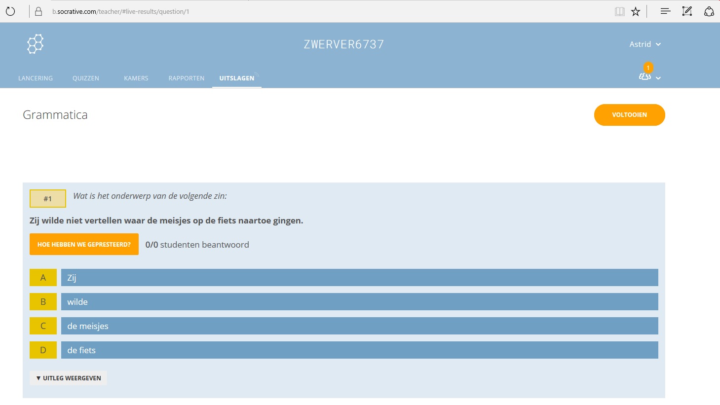 2.2.8. De docent toont aan dat hij kan werken met digitale toetssystemen. Ik heb meerdere keren verteld over Socrative. Naast een leuke quiz of het bevorderen van samenwerkend en actief leren (zie het voorbeeld bij 2.1.1. van het 'ruimteschip game') of het interactief maken van een instructie, is het vooral een digitaal toetssysteem. Ik heb dit programma meerdere keren gebruikt om de spelling- en grammaticakennis van leerlingen te toetsen. Hieronder vindt u een sceenshot van een grammaticatoets die ik heb gemaakt in Socrative: